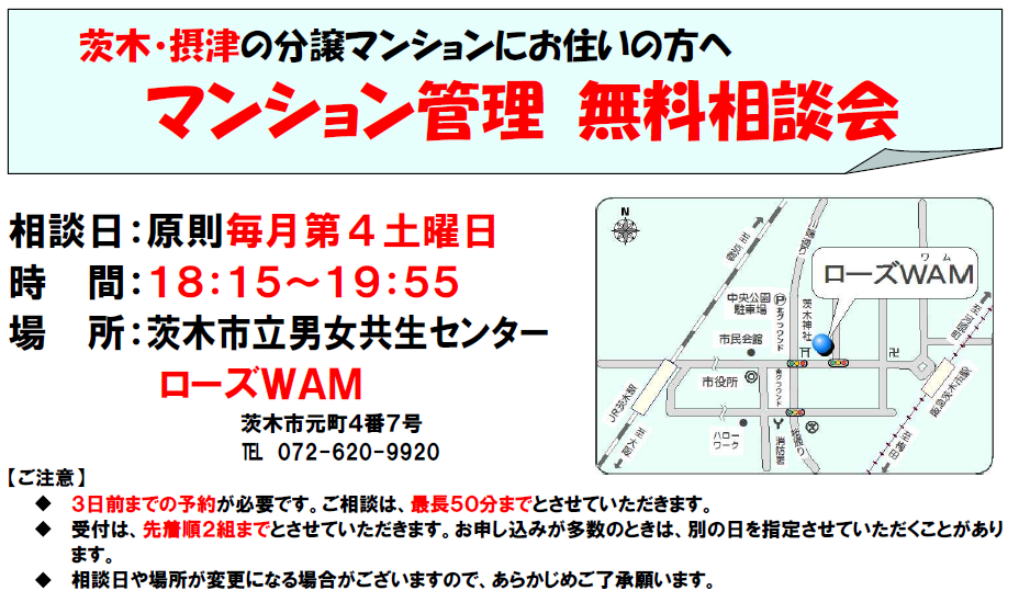 茨木・摂津支部開催の無料相談会は、原則、毎月1回、第4土曜日に開催しています。